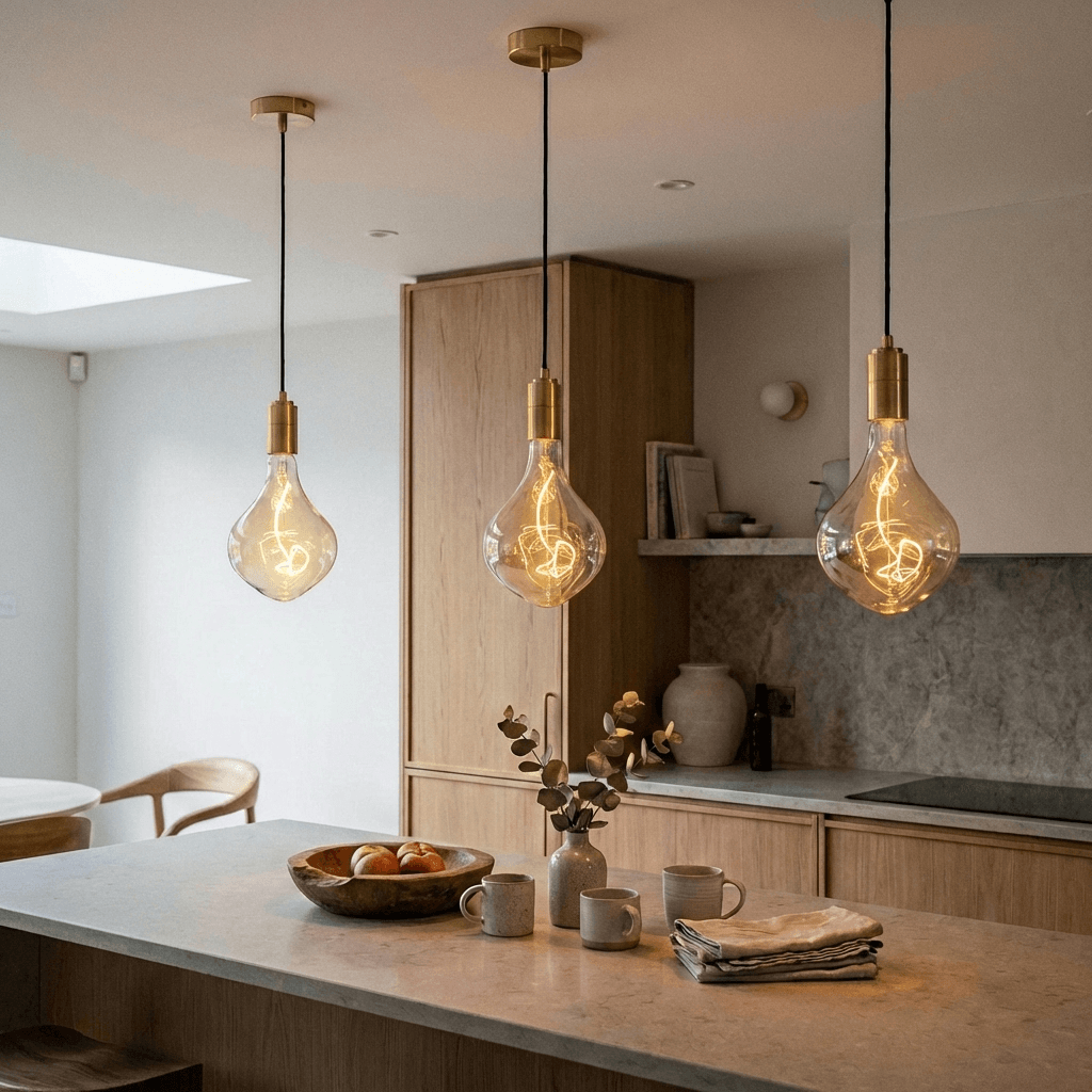 The pendant lights are huge, a lovely shade of amber and quite simply, stunning! 😊. Unfortunately, I can’t post a picture of them in their true glory as the kitchen has not been started - but the quality and craftsmanship are obvious.